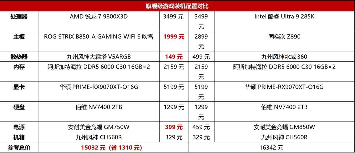 别看当前锐龙7 9800X3D和酷睿Ultra 9 285K的价格都是3499元,但是由于前者满载功率明显更低,因此在对主板供电、散热器性能以及电源功耗上要求更低。体现在具体硬件上,就算锐龙7 9800X3D搭配ATX B850,2000元以内就能拿下,而同级别Z890至少要2899元,光这一项就多了900元。再加上风扇和电源上多出的花销,锐龙7 9800X3D配置总价便宜了1310元。