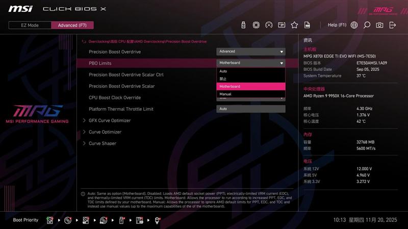 PBO Limits设置为主板,由微星MPG X870I EDGE TI EVO WIFI 刀锋 钛主板对CPU进行控制,可以最大限度释放