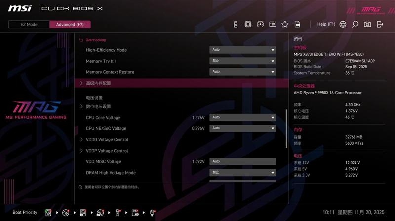 按F7进入高级模式之后,微星MPG X870I EDGE TI EVO WIFI 刀锋 钛主板也提供了大量更详尽的设置选项供用户使用,在系统状态页面也可以查看更加详细的电脑当前实时状态。