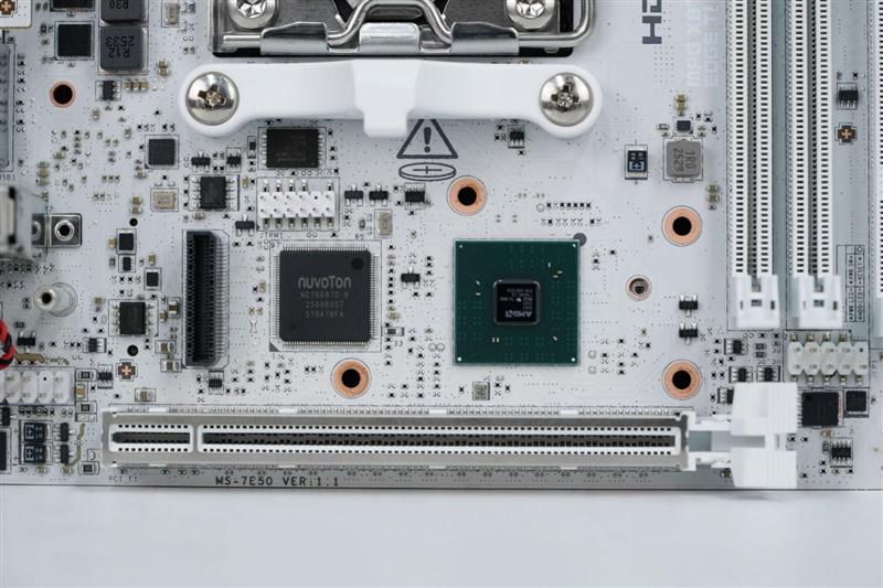 主板边缘处是一条合金强化的PCIe 5.0 x16的显卡插槽,RTX 5090这样的超重型显卡也能牢固安装,第二代扩展式PCIe卡扣,拆卸也更加方便。